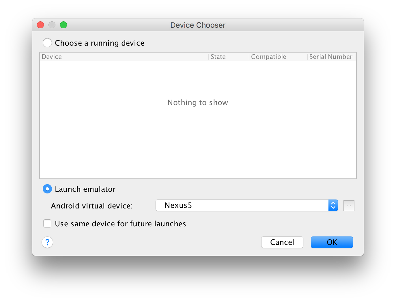 You will be given the option to choose which device to run your app on. We want to use the AVD we created previously, so choose it from the selector and click OK: