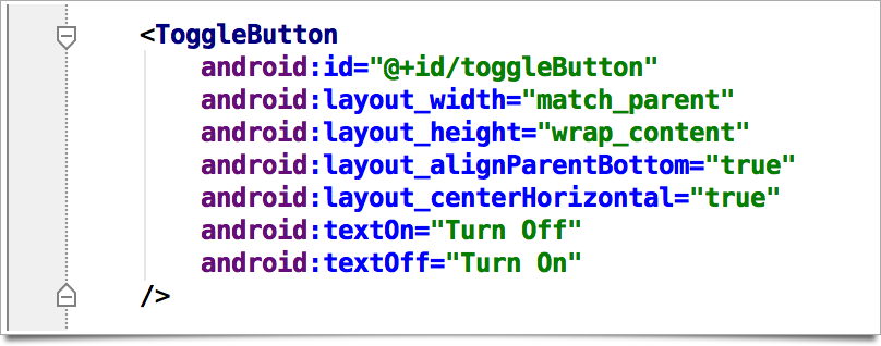 Now that we have a way to reference our Views in the Java code, let's add some functionality. What's our desired end state? For this example, we're going to make it so that when the ToggleButton is tapped, the background color toggles between white and black. To put it another way, our app will "listen" for you to tap on the button, and change the color of the RelativeLayout's background. To do this, we need to add an Action Listener. Modify your onCreate() method again..this time we'll add the code necessary to capture the user clickign on the ToggleButton. Your code should look like this:
